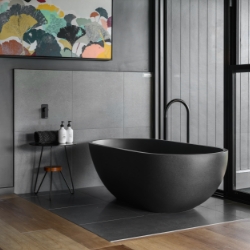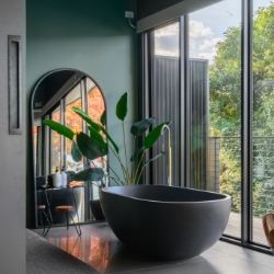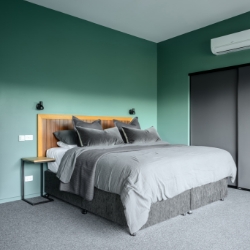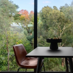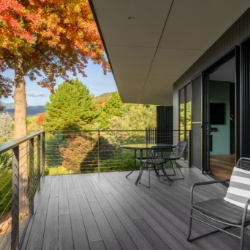 The large Barn door gives you access to the bedroom where you will find a granite bath at the window, giving you views across the valley and up to Mt. Bogong. Automated blinds give you privacy as required. A sumptuous King size bed with side benches and quality bed linen is provided. The spotted gum bedhead has in built reading lights. Sliding doors provide you with ample wardrobe space.