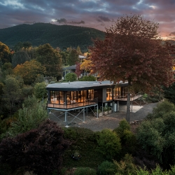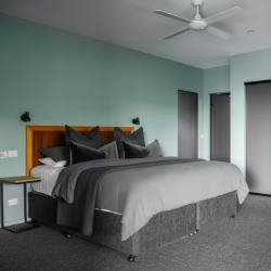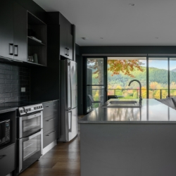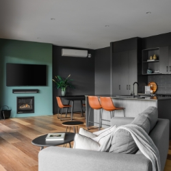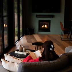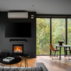 Inside you will find the fully equipped kitchen with huge stone bench and bench stools. The lounge area provides lounge suite, occasional chairs and side tables. A gas log fire will provide warmth and a supersized TV and sound bar linked to Smart Technology provide your entertainment.