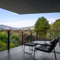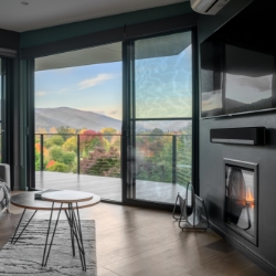 Entering this apartment you come into a hallway where the fully equipped laundry is located and bench seating is provided, under which outdoor footwear can be stored. Entering the main area you are surrounded by glass walls with views all around. The main view looks straight up the Ovens Valley and up to Mt. Bogong. One sliding door takes you onto the balcony where outdoor dining is provided while the other double sliding door takes you to the deck area where your lounge seating awaits, both of course have stunning views.